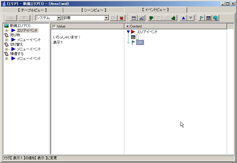 フラグは、まず「データウィンドウ」の【状態変数】というところで設定せねばなりません。その後にエリアでの設定になります。