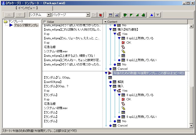 ・「購入」と書かれているメッセージコンテントを使うと、購入の確認画面となっている。値段を入れ(必要なら商品名を入れるといい)ると、ゲーム中で「購入」を押したとき、即座に買わなくて済む(間違って押した場合の救済措置だが、要らないという人もいるかも)