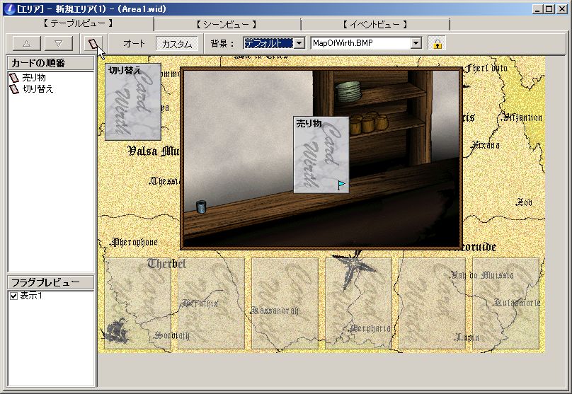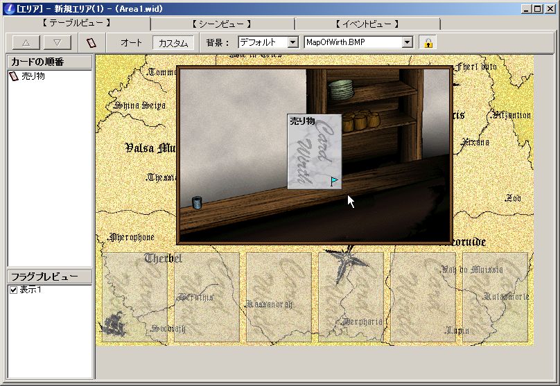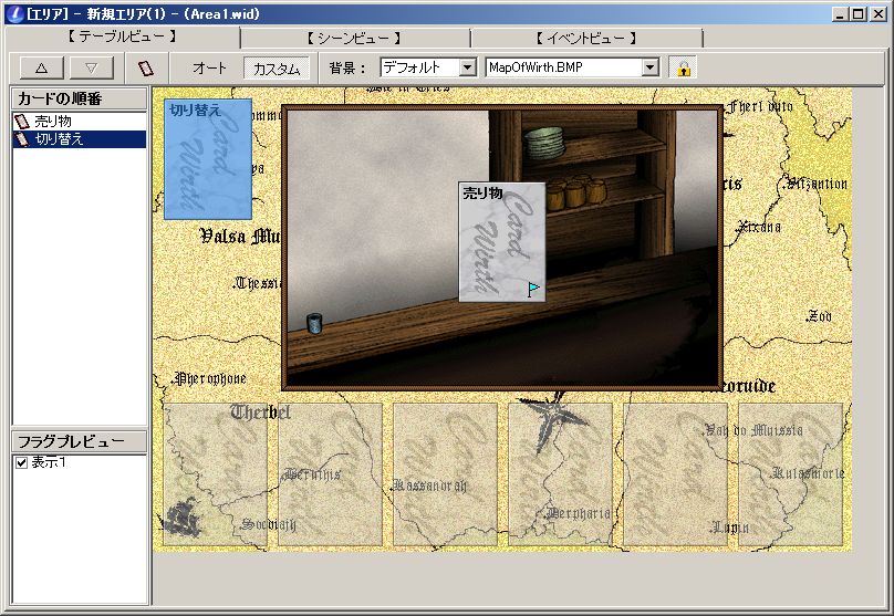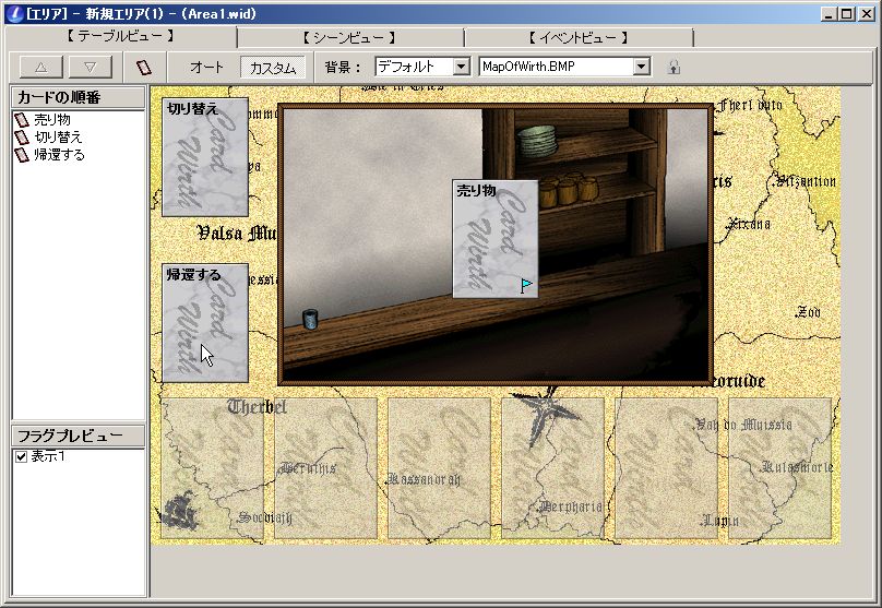 中身にはそれぞれ来店時の処理やカードの表示切替処理が仮組みされており、イベントビューの中にメッセージコンテントの形として、またカード裏説明の部分(テーブルビューからダブルクリックして確認)の中にそれぞれ説明を書いてあります。
