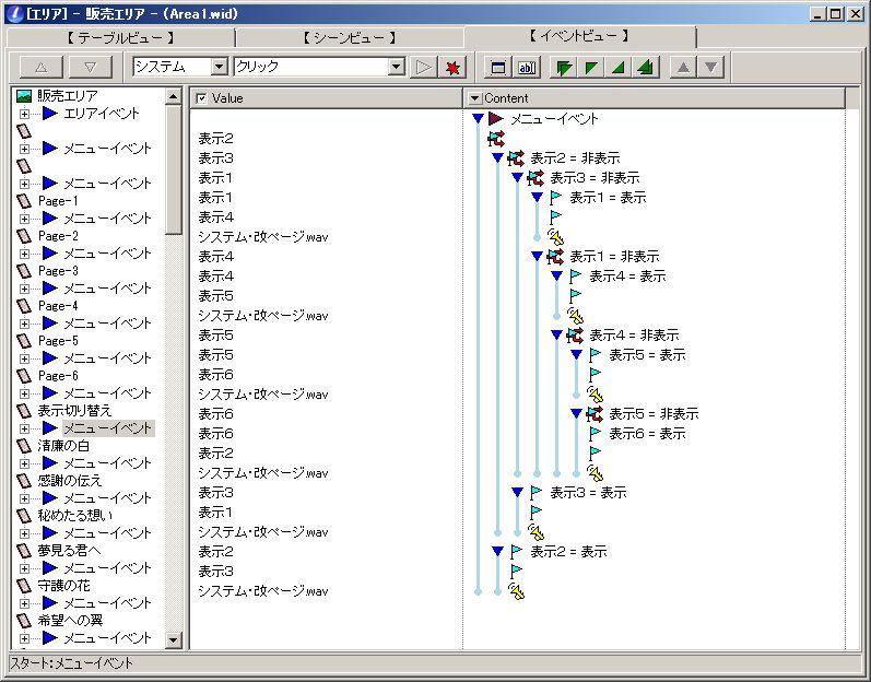 ページ切り替えには2通りの方法がありますが、今回はフラグを使ったものを説明します。汎用性が高いです。(なお、もう一つの方法はエリアを分けてエリア間移動をすることですが、どうしても必要な理由が無い限りあまりお勧めしません。例えば拙作の場合、「雪降る桜の樹の下で」で背景切り替えが面倒という理由からエリア移動による表示切替を行ったりしているので、一概に否定するものでもないですが)