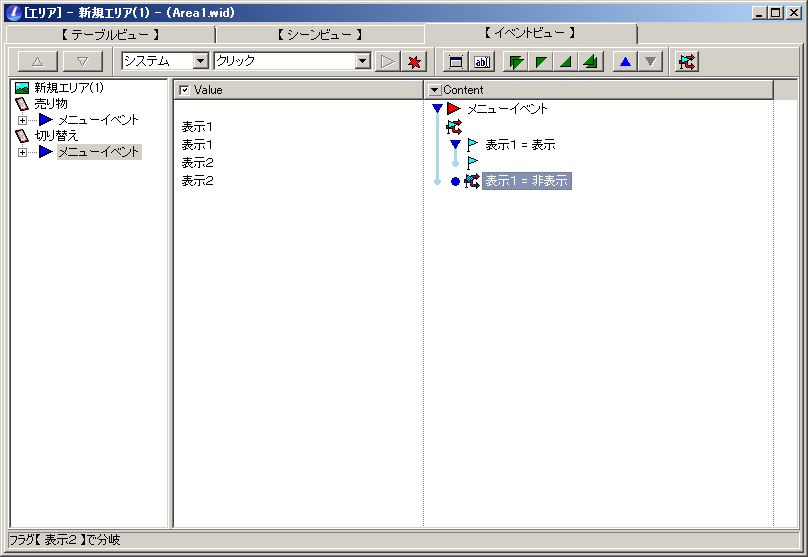 該当するフラグが表示か否か判断するのには、まず「フラグ分岐」のコンテントを選択、イベントビューに入れます。