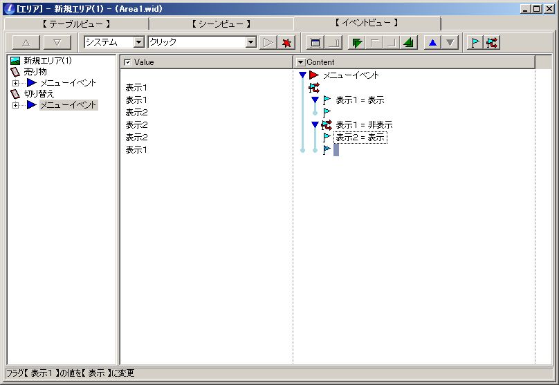 フラグは、まず「データウィンドウ」の【状態変数】というところで設定せねばなりません。その後にエリアでの設定になります。