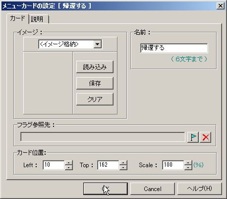 同じ画像を何度も使うときには、イメージ格納のプルダウンメニューを使って設定することを推奨します。こうすると、画像をシナリオフォルダ内から勝手に参照してくれるので、容量が少なくて済むのです。(上手く説明できないのですが)