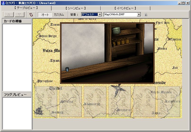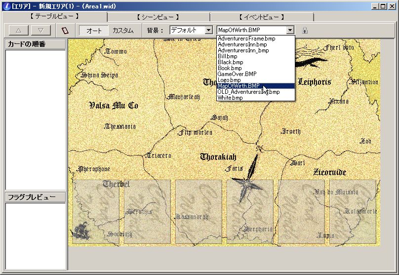 テーブルビュー→カードを置いたり、背景を設定する場所。デフォルトの画面のマップ画像はここで設定される。