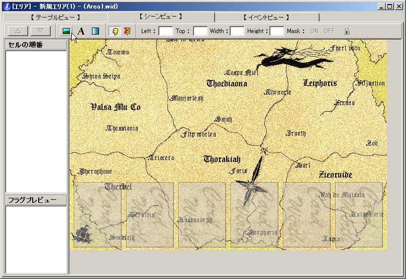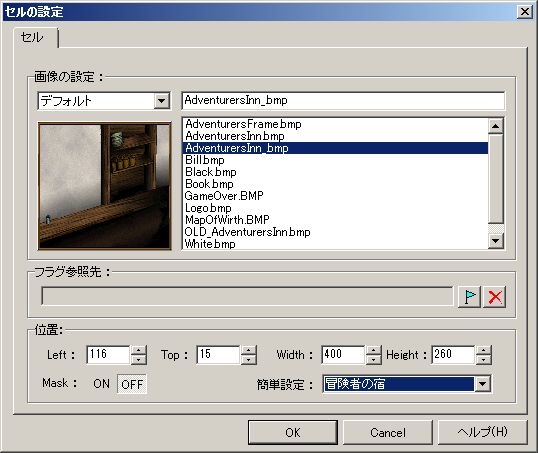 シーンビュー→セルという単位で背景の上に画像を置ける場所。例えば、デフォルトの冒険者の宿の画像の、宿の画像はここで設定される。
