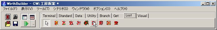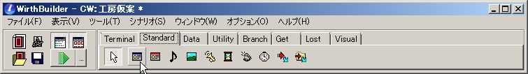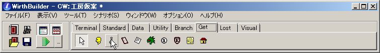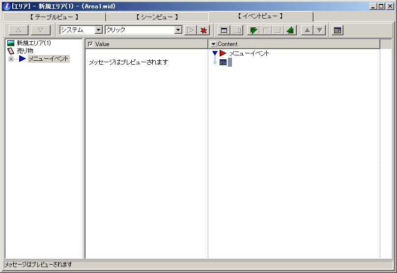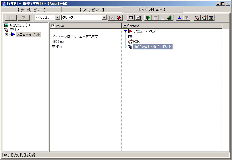 で、まずはカードの購入処理から進めましょう。購入処理を組みたいカードを横のパレットからクリックして選択。その状態で、上のプルダウンメニュー「システム」「クリック」の横にある青い矢印ボタンをクリックします。
