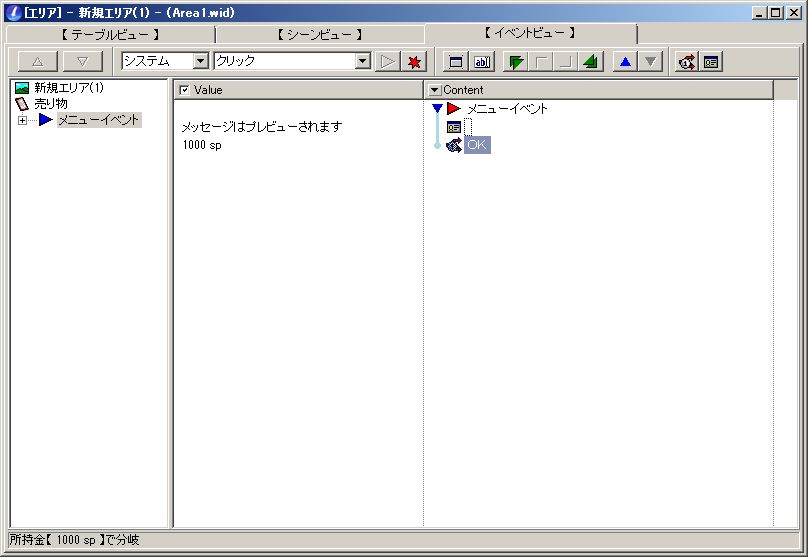 この下に、再び「Standard」からメッセージコンテントを選んで、内容を入力してから、「イベントビューにある、先ほど作った所持金分岐コンテント」をクリック。