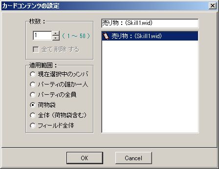 この画面だとまだ1枚しかスキルが無いですが、カードに合致した売り物を選んで、「適用範囲」は「荷物袋」を選択(とは書きましたが実は「全体(荷物袋含む)」でも問題なく荷物袋に入るはずではあるのですが念のため)、「OK」を押します。