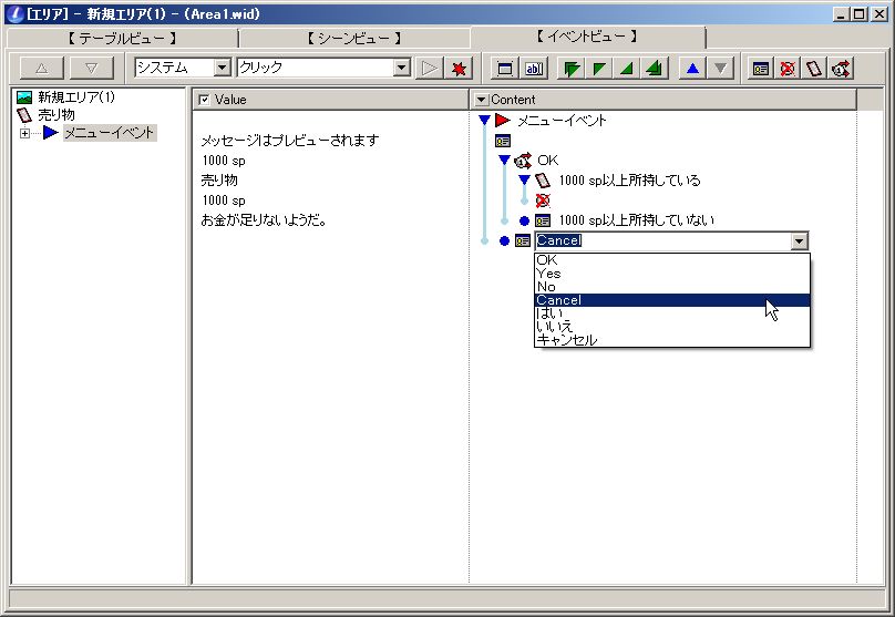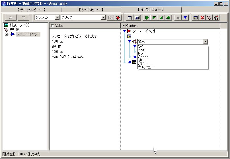 先ほどの所持金分岐コンテントも横の「OK」をクリックしてプルダウンメニューを表示させるのは一緒ですが、ここには文言を書き込むこともできます。例えば今回は購入処理を始めるため「購入」と入れてみました。