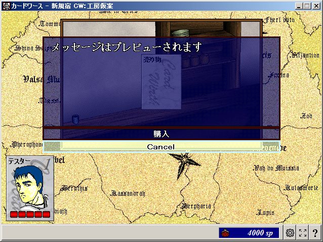 「購入」を選ぶと所持金判定のあとカードが入手でき(所持金が足りなければエラーメッセージが表示される)、キャンセルを選ぶと何もおきません。